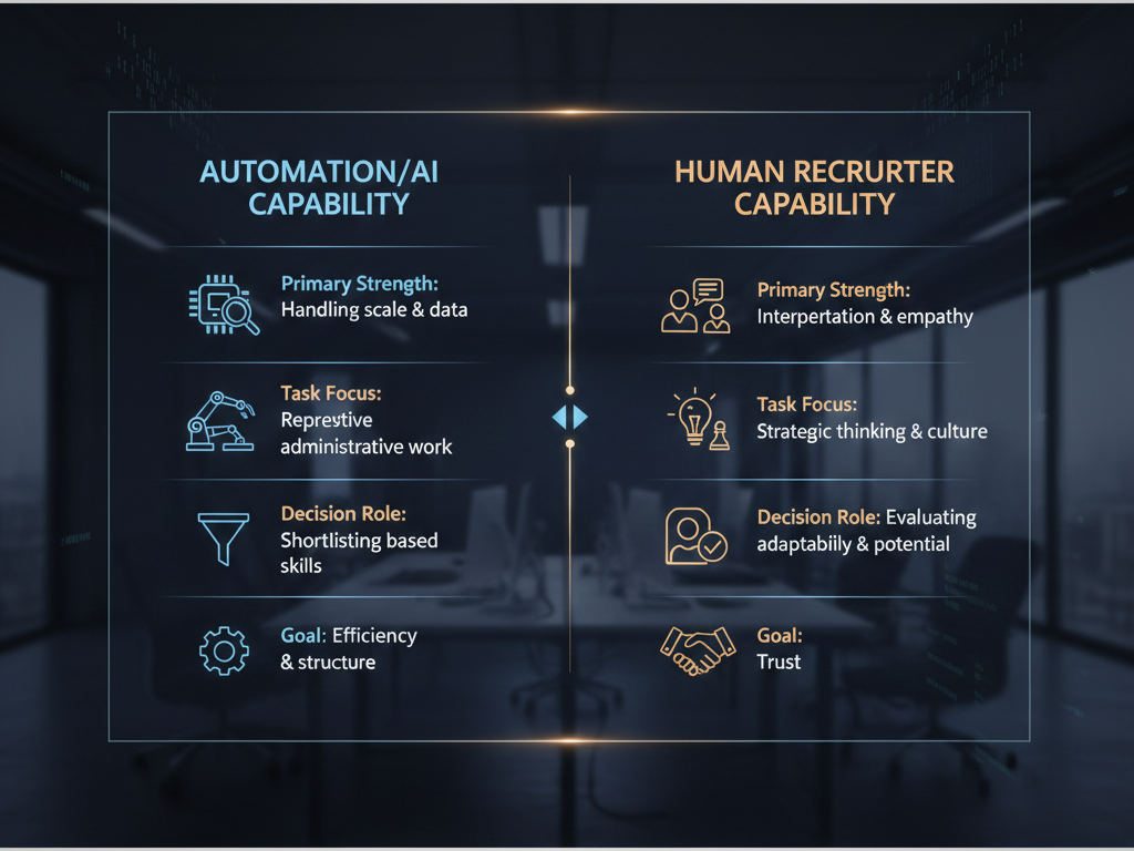 AI excels at handling scale and data-driven tasks. Recruiters excel at interpretation, communication, and decision-making. When combined effectively, both strengths complement each other.